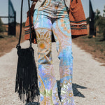 Fanelora | Sonnenstrahlen Schlaghose glänzt mit ihren komplexen, mandala-inspirierten Drucken in sanften Blau-, Gold- und Erdtönen. Der hohe Taillenschnitt und das ausgestellte Bein schaffen eine schmeichelhafte, bohemian Silhouette, perfekt für Festivals, kreative Zusammenkünfte oder um ein Statement-Stück in deine Alltagsgarderobe zu integrieren.