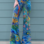 Fayenne | Künstlerische Schlaghose sprüht vor lebendiger Energie und zeigt wirbelnde Muster sowie florale Details in satten Blau-, Grün- und Orangetönen. Mit ihrem schmeichelhaften High-Waist-Schnitt und der weiten Silhouette sind diese Hosen perfekt, um bei Festivals, kunstinspirierten Ausflügen oder wann immer du deine Individualität zur Schau stellen möchtest, ein mutiges Statement zu setzen.
