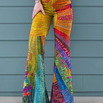 Fayora | Strahlende Patchwork-Flaggenhose strahlt mit ihrem von Regenbögen inspirierten Patchwork-Design, das warme Gelbtöne, feurige Rottöne und kühle Blautöne zu einem lebhaften Statement-Stück vereint. Der hochgeschnittene Schnitt und die ausgestellte Silhouette verleihen einen schmeichelhaften Retro-Vibe, perfekt für Festivals, kreative Ausflüge oder um Alltagsoutfits unvergesslich zu machen.