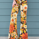 Fiorinda | Retro Gänseblümchen Schlaghose verkörpert den Geist der 70er Jahre mit ihren auffälligen Gänseblümchen-Drucken in warmen Orange-, Gelb- und Cremetönen. Mit einem schmeichelhaften hohen Taillenschnitt und weitem Bein bringen diese Hosen einen nostalgischen, aber stilvollen Akzent in deine Garderobe – perfekt für Festivals, lässige Tage oder retro-inspirierte Outfits.