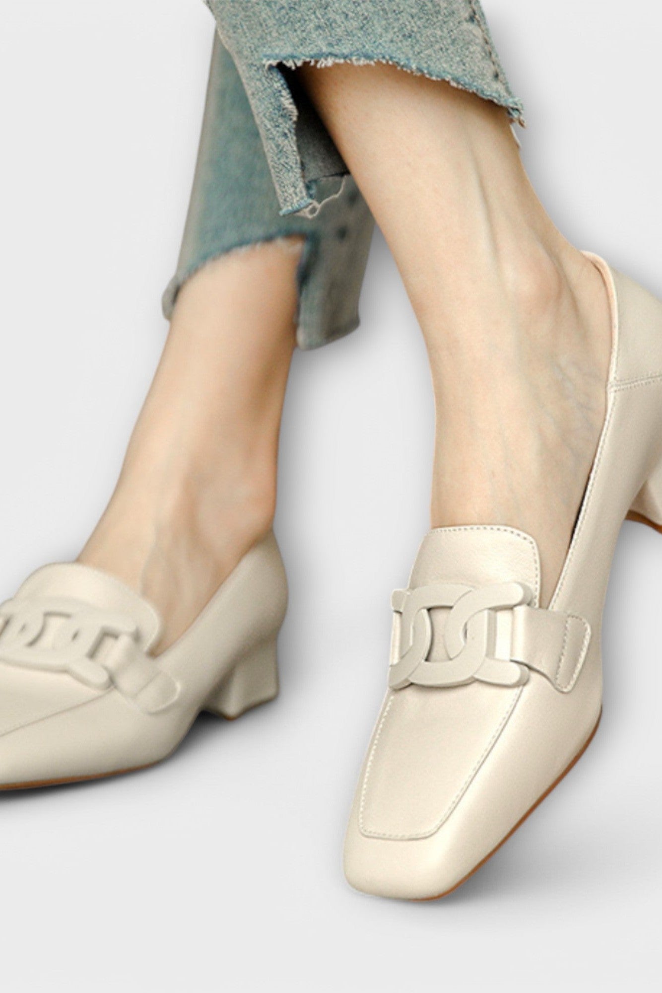 • Design: Quadratische Spitze mit Kettendetail und niedrigem Blockabsatz