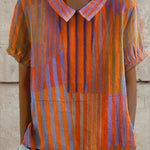 Nina | Geometrisches Streifenhemd kombiniert kräftige, lebendige Farben mit einem kunstvollen Design aus kontrastierenden Streifen in Orange, Lila und Blau. Das geometrische Muster schafft einen dynamischen und modernen Look, der es zum perfekten Stück für Frauen macht, die ihre kreative Seite lieben. Stellen Sie sich vor, Sie tragen es an einem Ausflugstag, die auffälligen Farben spiegeln Ihren lebhaften und abenteuerlichen Geist wider.