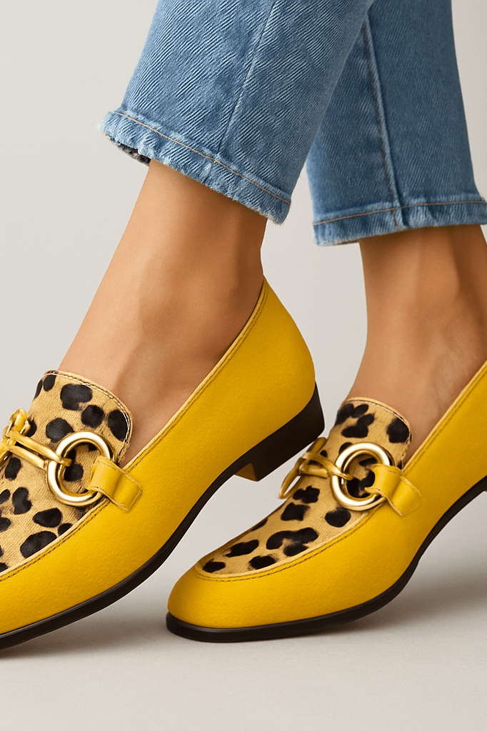 Der Sonia Loafer ist der Ort, wo kühn auf schön trifft. Mit einem sonnengelben Körper, einem wilden Leopardenmuster und glänzenden goldenen Details ist Sonia dafür gemacht, ein selbstbewusstes Statement zu setzen. Es ist die perfekte Mischung aus lebendiger Farbe, wilder Textur und zeitloser Loafer-Eleganz – ideal für Tage, an denen Ihr Outfit für sich sprechen soll. Leicht, bequem und voller Persönlichkeit, verleiht Sonia jedem Look sofortigen Flair. Von lässigen Denim-Outfits bis hin zu monochromen Looks ist dies Ihr Lieblingsakzentstück für einen gehobenen Alltagsstil.