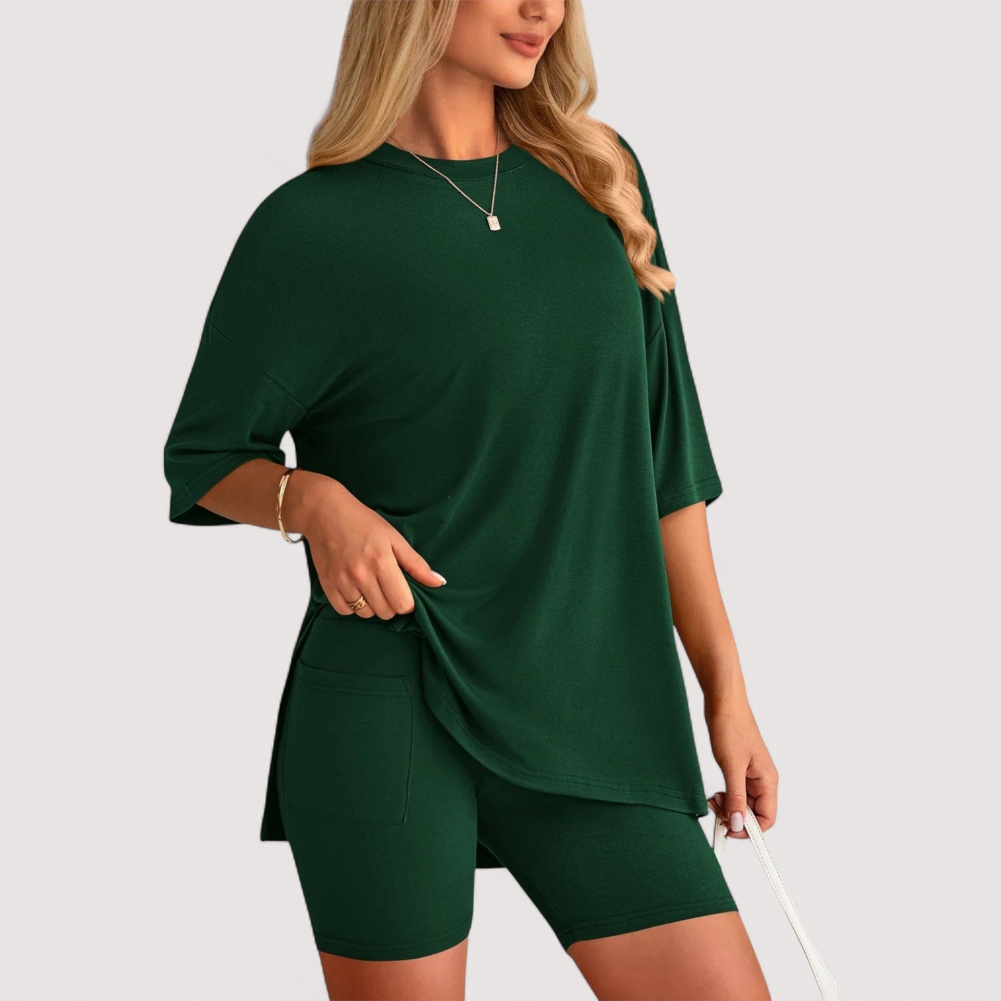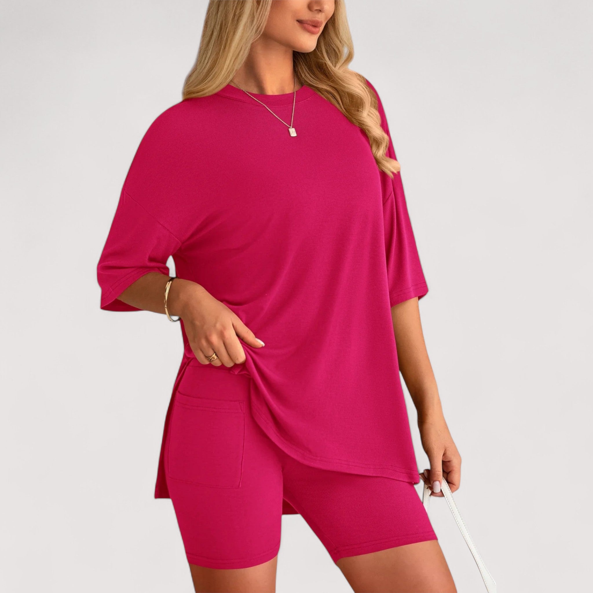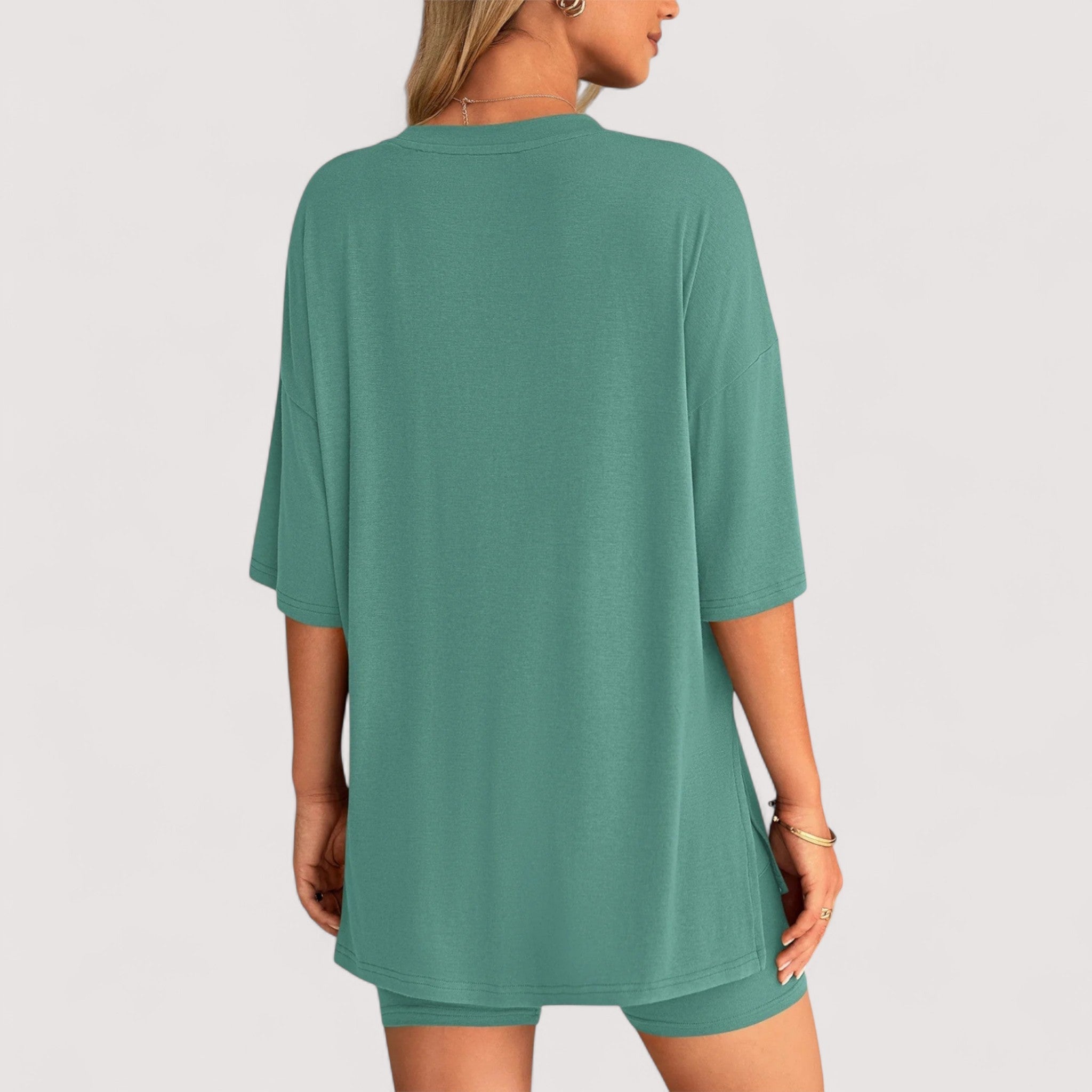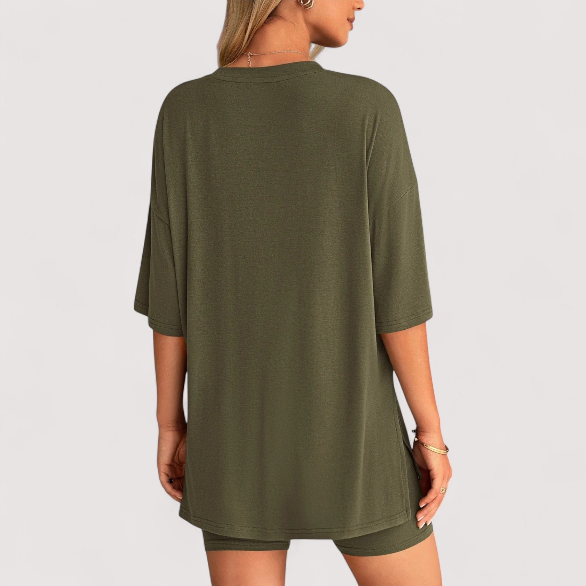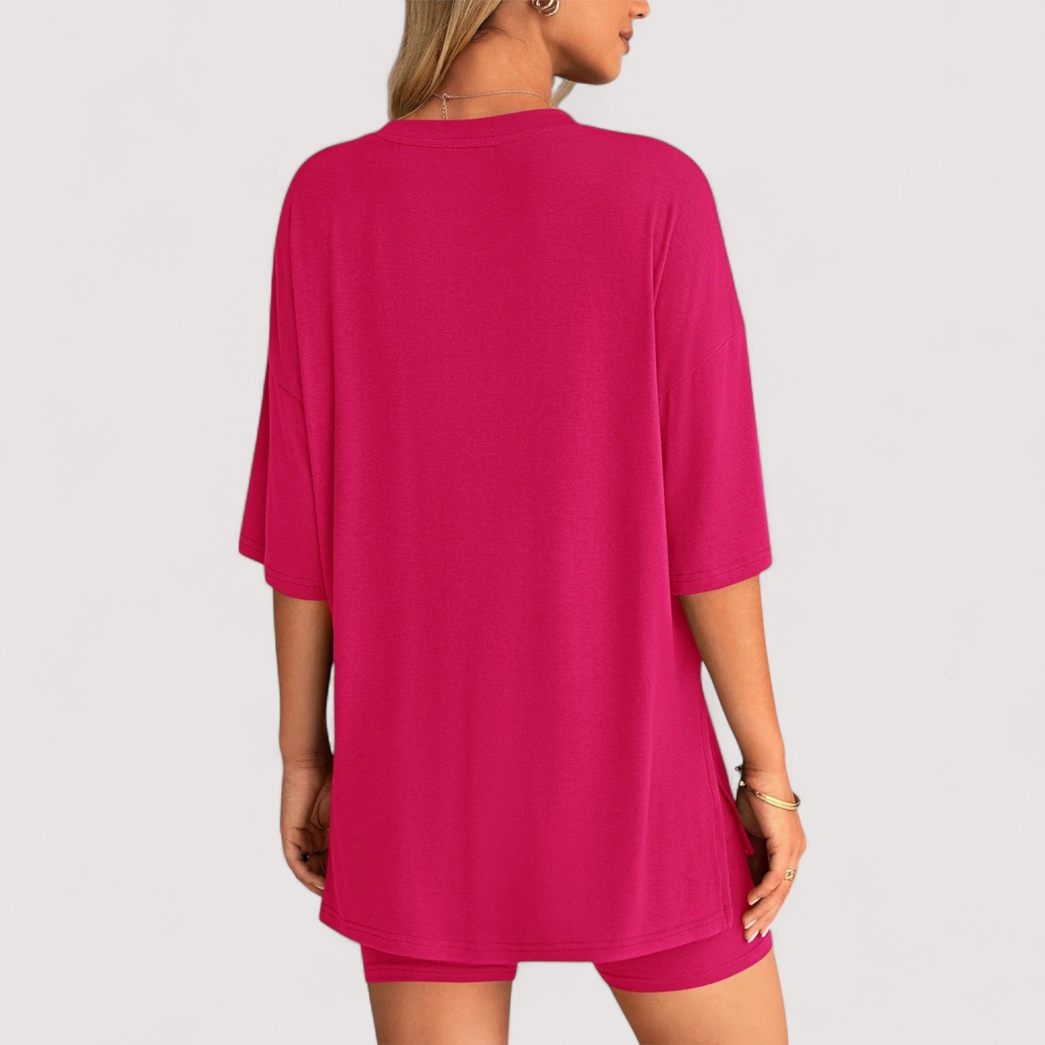 • Komfort & Freiheit: Lockeres T-Shirt und hoch taillierte Shorts für bequeme Passform und unbegrenzte Bewegungsfreiheit.
