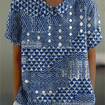 Zara | Tribal Print Shirt verfügt über ein kühnes und auffälliges blau-weißes tribal-inspiriertes Muster, das überall, wo Sie hingehen, ein Statement setzt. Stellen Sie sich vor, Sie tragen dieses Hemd während eines Wochenendausflugs am Strand, die lebendigen Muster tragen zur unbeschwerten, stilvollen Atmosphäre des Moments bei. Dieses Hemd ist perfekt für Frauen, die einzigartige, auffällige Designs lieben, die herausstechen.
